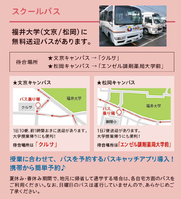 多くの福大生が通っており、学事や授業に応じて臨機応変にスケジュール対応してくれる。