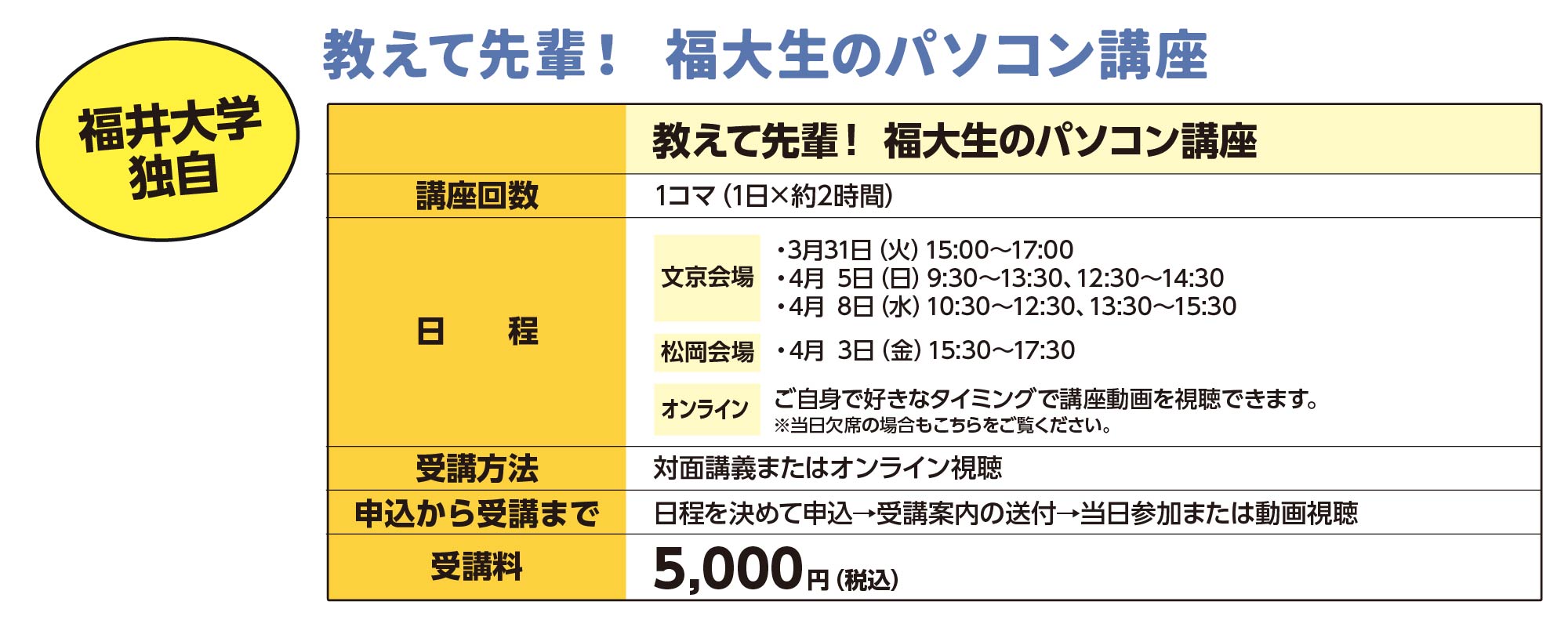 単なるPCのスキル指導だけでなく学科ごとのレポートの書き方や予習授業では教わらない、福大ならではの便利スキルを学ぶことができます!