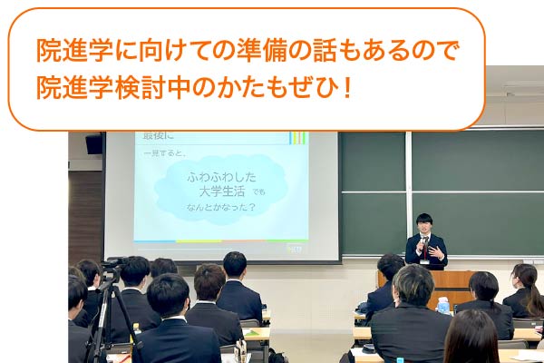 進路選択・就職活動を経験した4年生や今社会人として活躍している福井大学の卒業生の先輩の経験を直接聞き、自分のなりたい大学生像・社会人像を描くヒントを学びます。