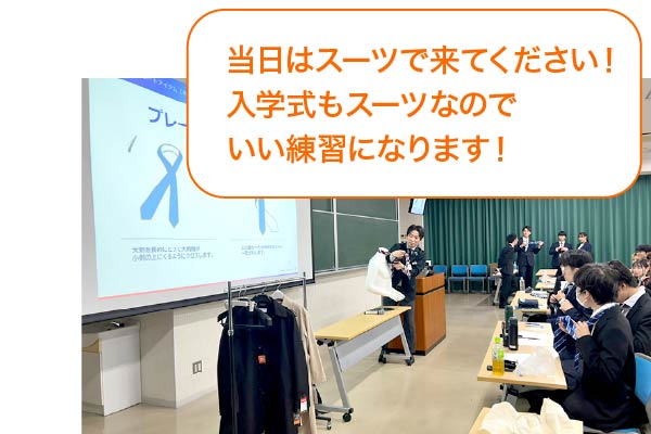 大学では学べないスーツの着こなし方や、ビジネスマナーについて、実演を交えながら学びます。